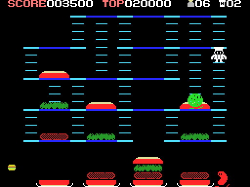 햄버거 재료들을 모두 밟아 아래로 떨어뜨려 햄버거를 완성시키는 것이 목표입니다.
