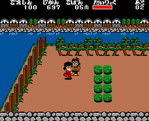 화면 위쪽 상태 표시창은 왼쪽부터 고에몽(점수), 시간, 금화, 체력, 라이프 순입니다.