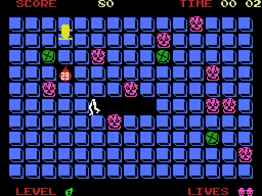 보라색 적 캐릭터가 있는 칸과 노란색 적 캐릭터를 피하며 1개씩 등장하는 맵상의 폭탄 5개를 모으면 스테이지 클리어.